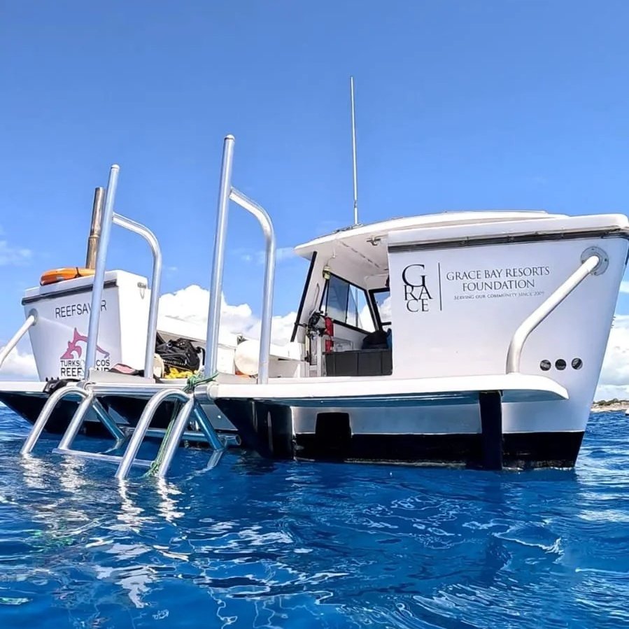 Thanks to a generous donation from the Grace Bay Resorts Foundation we were able to replace the engine in the Reefsaver late last year. We’re happy to say she’s still running smoothly and she just got a little makeover to reflect the partnership.